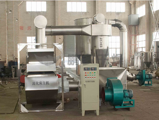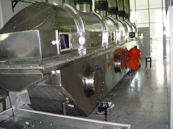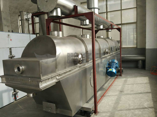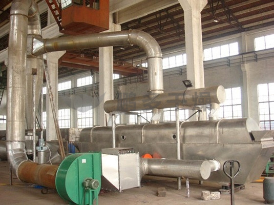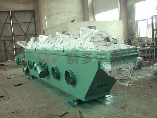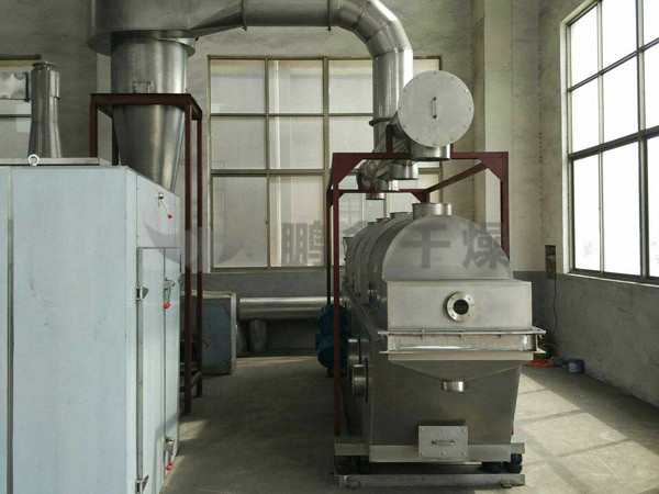 物料自進料進口進入機內(nèi),在振動力作用下,物料沿水平面流化床拋擲,向前連續(xù)運動,熱風向上穿過流化床同濕物料換熱后,濕空氣經(jīng)旋風分離器除塵后由排風1:3排出,干燥物料由排料進口排出。