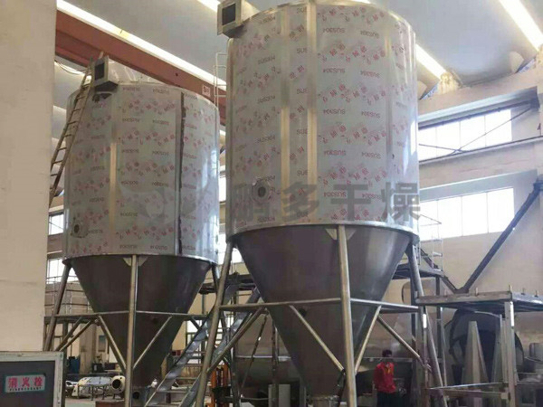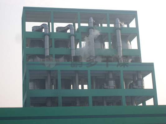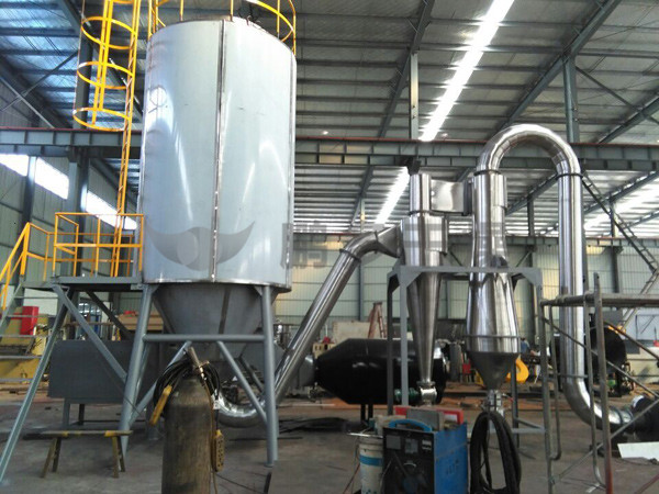 本機(jī)組工作過(guò)程為料液通過(guò)隔膜泵高壓輸入,噴出霧狀液滴,然后同熱空氣并流下降,大部分粉粒由塔底排料口收集,廢氣及其微小粉末經(jīng)旋風(fēng)分離器分離,廢氣由抽風(fēng)機(jī)排出,粉末由設(shè)在旋風(fēng)分離器下端的授粉筒收集,風(fēng)機(jī)出口還可裝備二級(jí)除塵裝置,回收率在96-98%以上。